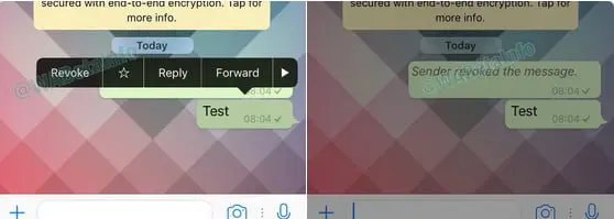 La noticia nos llega desde WaBetInfo, donde han publicado que la nueva versión beta de WhatsApp para iOS ya permite eliminar los mensajes enviados. Esta funcionalidad es accesible desde el propio chat, una vez localizamos el mensaje que queremos eliminar, dejamos pulsado sobre este y nos aparecerá una nueva opción para “Revocar” el mensaje.